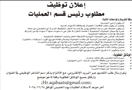 مطلوب رئيس قسم عمليات للعمل في العقبة