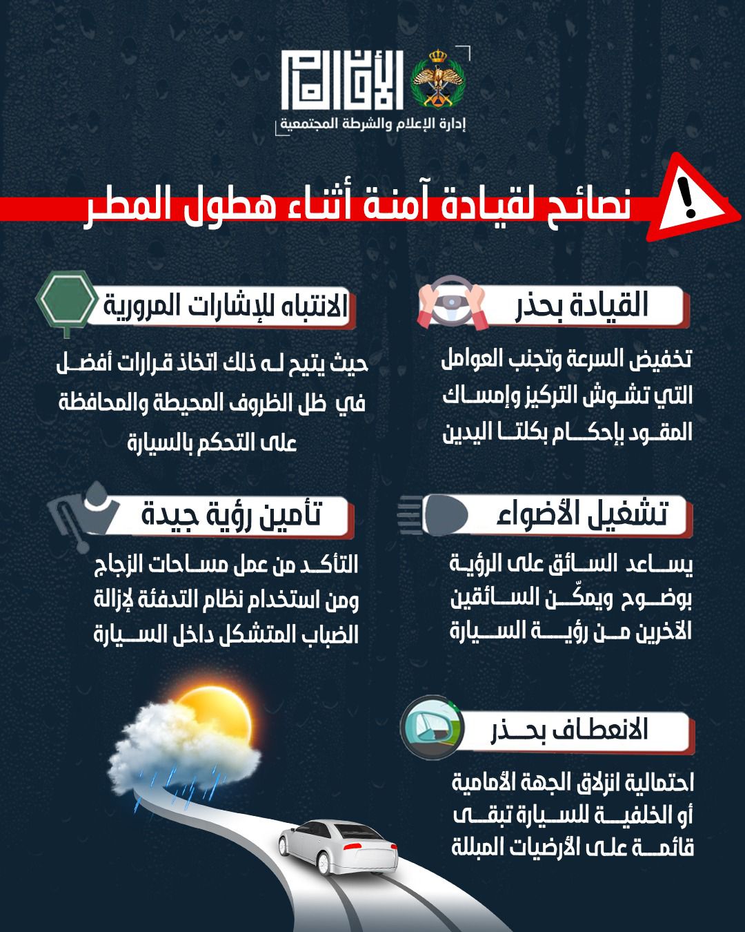 ودعت مديرية الآمن العام السائقين إلى ضرورة توخي الحذر خلال قيادة المركبات خلال الظروف الجوية التي تشهدها المملكة.