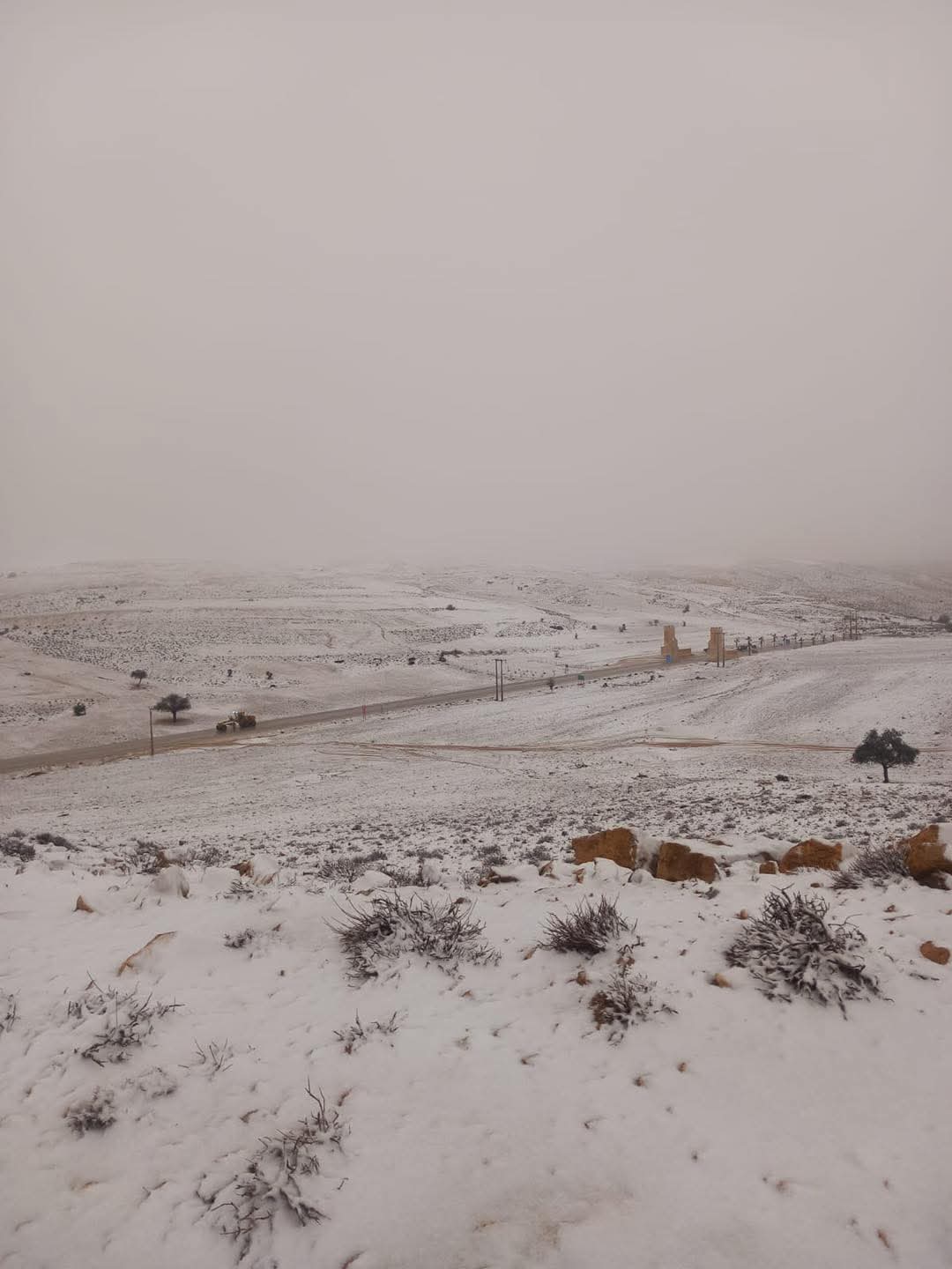 وشهدت منطقة الهيشة قرب وادي موسى جنوبي المملكة، تساقط زخات من الثلوج في ساعات الصباح الباكر.