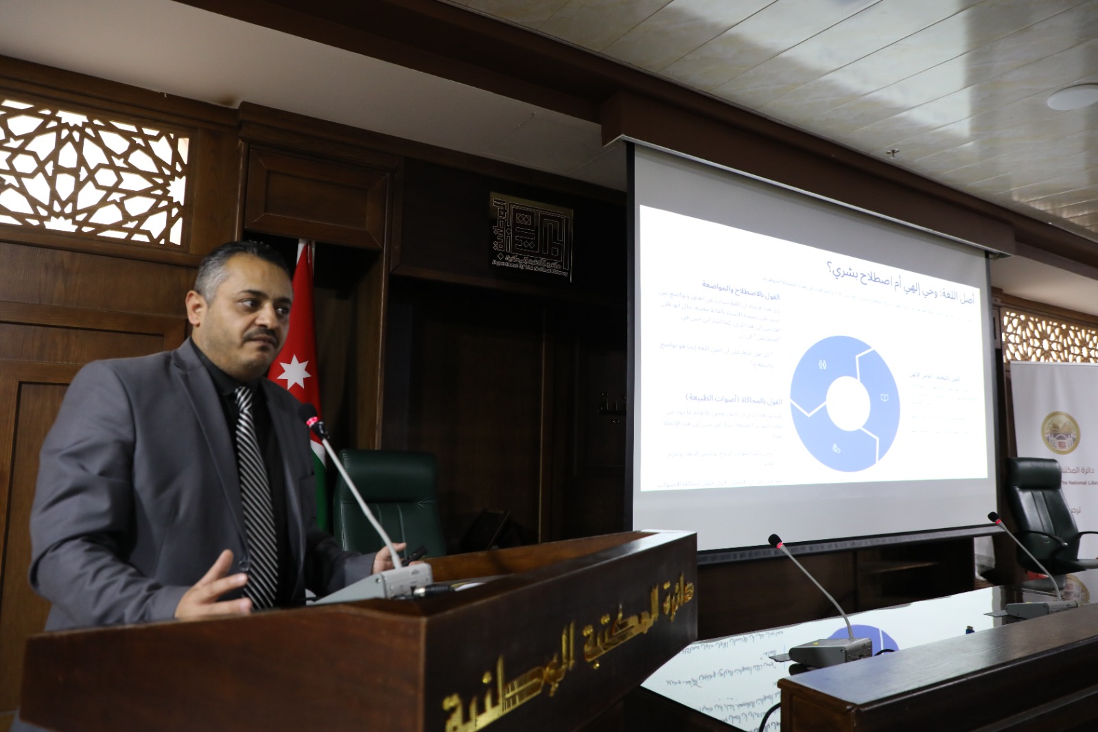 عمون - برعاية مدير عام المكتبة الوطنية الأستاذ فراس الضرابعة، وبمناسبة الاحتفال بيوم اللغة العربية، أُقيم في المكتبة الوطنية اليوم الأربعاء محاضرة بعنوان "اللغة العربية بين دعائم البقاء وديناميكية العصرنة"، للدكتور هيثم الثوابية تخلله افتتاح معرض للخط العربي بالتعاون مع مركز البرزنجي للفنون واللغات -العلم للجميع، بالإضافة إلى توزيع كتب ثقافية احتفاء بتلك المناسبة. |