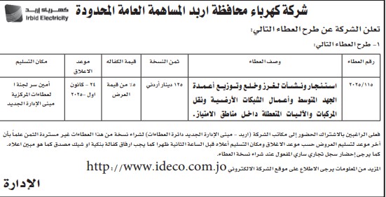عطاء صادر عن شركة كهرباء اربد