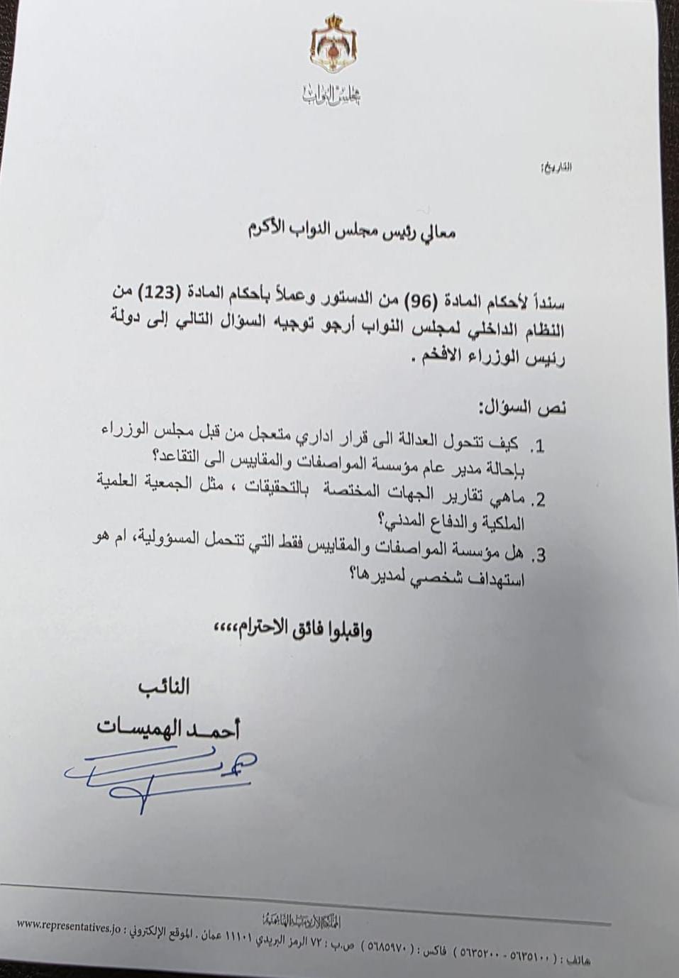 عمون - وجّه النائب أحمد الهميسات سؤالاً نيابياً إلى رئيس الوزراء، استناداً لأحكام المادتين (96) من الدستور و(123) من النظام الداخلي لمجلس النواب، تساءل فيه عن الأسس القانونية والإدارية لإحالة مدير عام مؤسسة المواصفات والمقاييس إلى التقاعد بقرار إداري متعجّل من مجلس الوزراء.