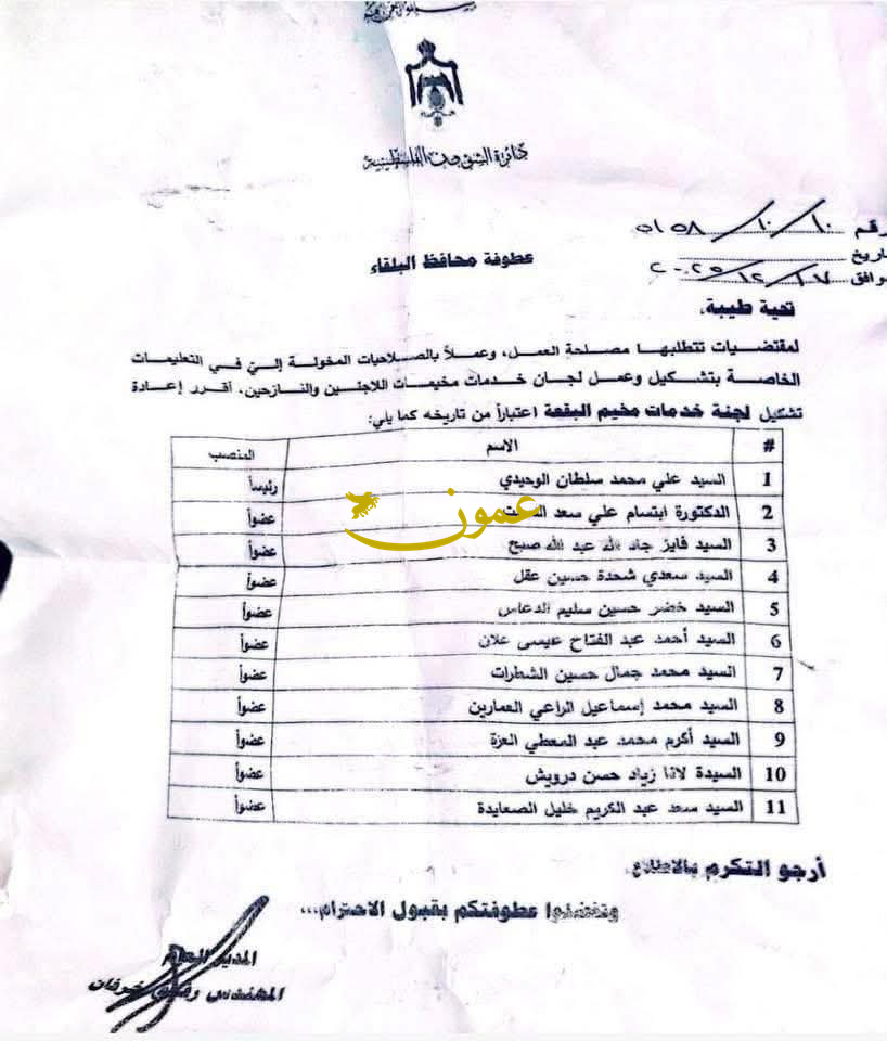 إعادة تشكيل لجنة خدمات مخيم البقعة (أسماء)