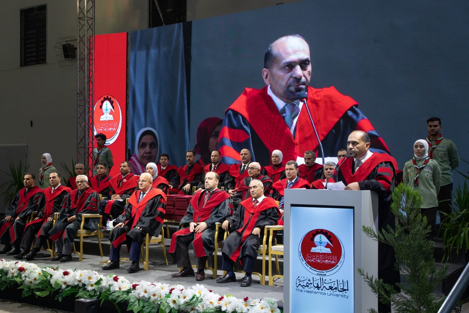 وألقى عميد شؤون الطلبة / رئيس اللجنة العليا لحفل التخريج الدكتور أيمن عليمات كلمة قال فيها: يغمرنا الفخر وتفيض قلوبنا اعتزازًا ونحن نحتفي بهذه الكوكبة المشرقة من خريجي الجامعة الهاشمية، ونزفّهم اليوم وفاءً لرسالتها العميقة في إعداد جيل متميز، قادر على صناعة مستقبل الأردن الزاهر، والمساهمة في بناء الوطن الذي أراده جلالة الملك عبدالله الثاني ابن الحسين، وطنًا قويًا بالعلم، شامخًا بأبنائه، ثابتًا على قيمه.