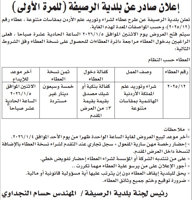 عطاء توريد علم الاردن بمقاسات متنوعة لبلدية الرصيفة