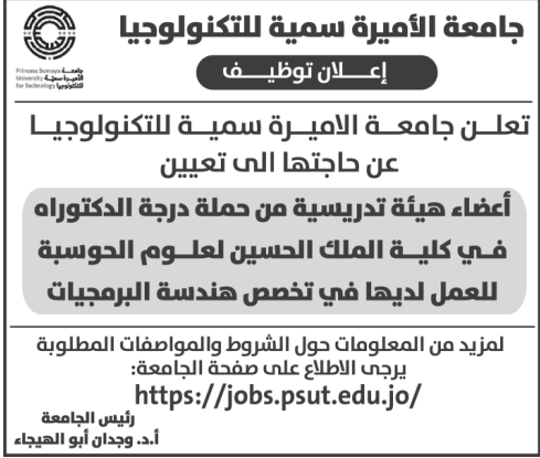 جامعة الاميرة سمية للتكنولوجيا بحاجة لتعيين اعضاء هيئة تدريسية