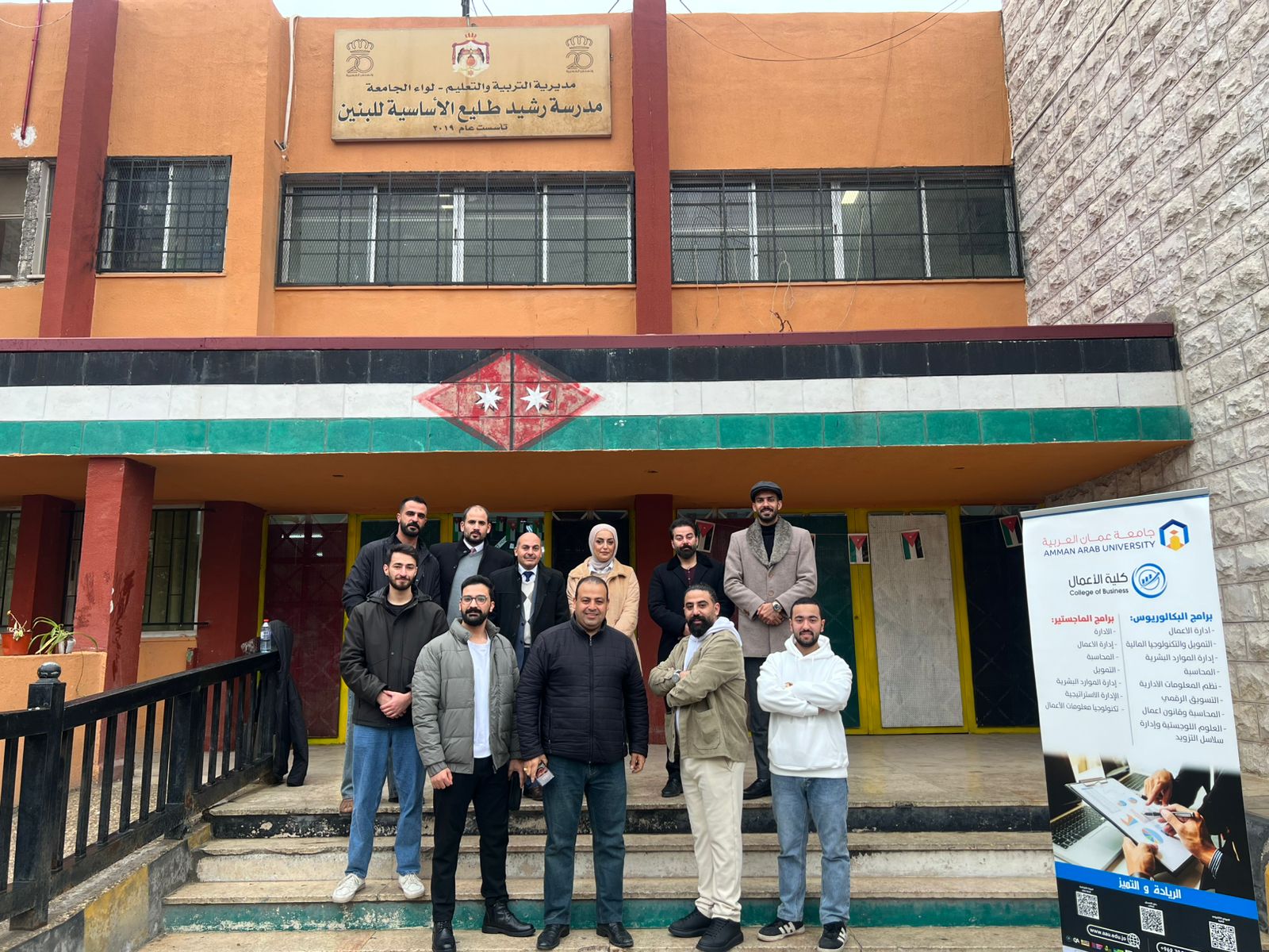 عمون - انسجامًا مع رؤية جامعة عمان العربية الهادفة إلى تعزيز دورها المجتمعي وتوجيه الطلبة نحو اختيار تخصصاتهم الجامعية بما يتلاءم مع متطلبات سوق العمل، نظمت كلية الأعمال ومن خلال قسمي التسويق، ونظم المعلومات الإدارية زيارة ميدانية إلى مدرسة رشيد طليع الثانوية للبنين في العاصمة عمّان، بمشاركة عدد من أعضاء الهيئة التدريسية وطلبة الكلية