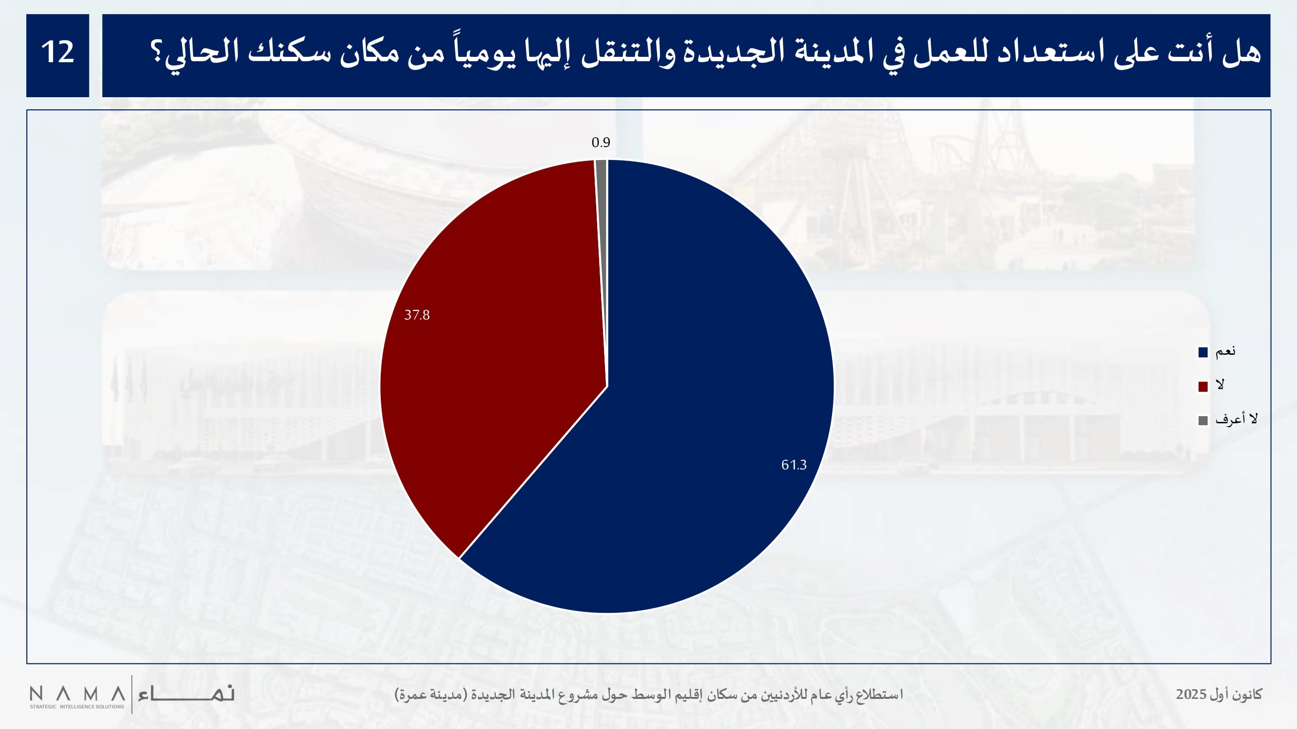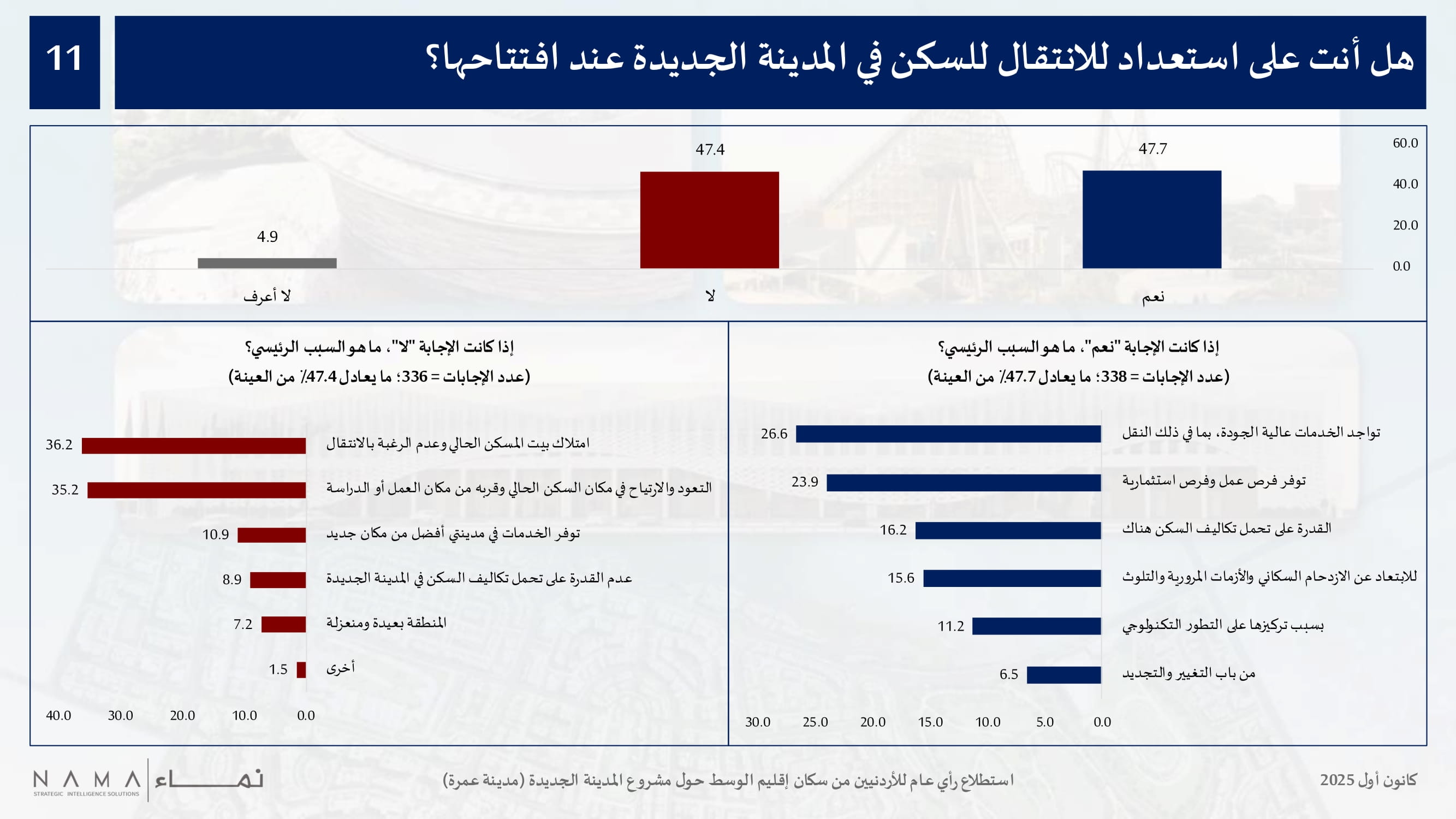 وعند السؤال عن مدى استعدادهم للانتقال للسكن في المدينة الجديدة عند افتتاحها، جاءت النتائج متقاربة تماما، حيث أفاد 47.7 بالمئة من الأردنيين من إقليم الوسط بأنهم على استعداد لذلك، مشيرين إلى أسباب عديدة مثل توفر الخدمات عالية الجودة، وتوفر فرص عمل وفرص استثمارية واعدة، والقدرة على تحمل تكاليف السكن هناك، والابتعاد عن الازدحام السكاني والأزمات المرورية، والتطور التكنولوجي المنتظر في المدينة الجديدة.