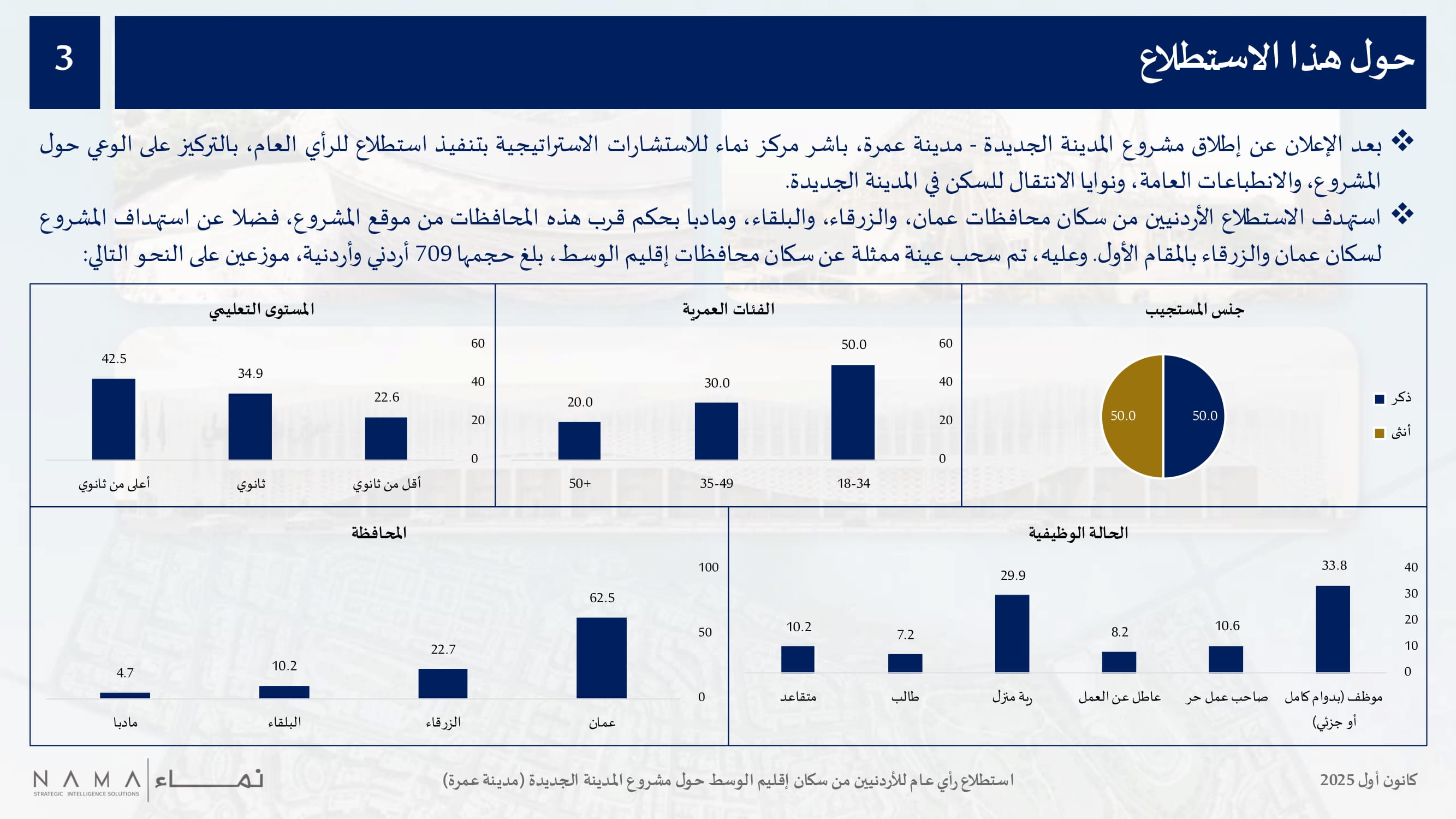 عمون - نفذ مركز نماء للاستشارات الاستراتيجية استطلاعا للرأي العام حول مشروع المدينة الجديدة – مدينة عمرة، وذلك لقياس مستوى الوعي العام حول المشروع ونوايا الانتقال للسكن في المدينة الجديدة، حيث استهدف الاستطلاع الأردنيين من سكان محافظات عمان، والزرقاء، والبلقاء، ومادبا.