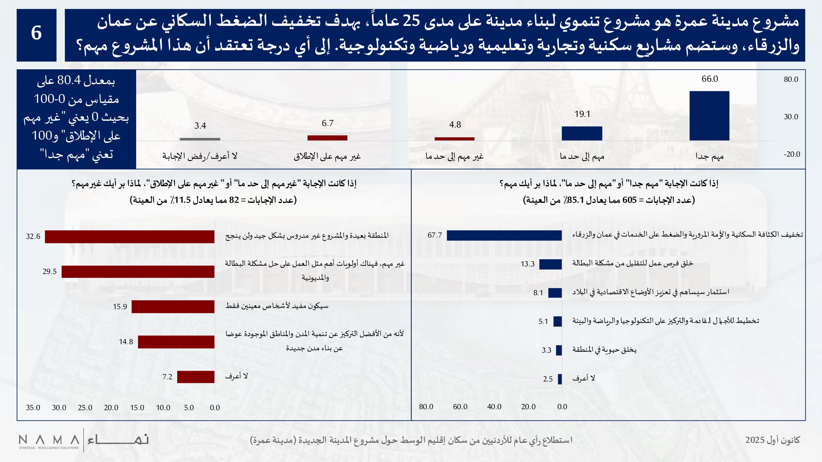 وعند تزويدهم بالشرح الرسمي حول المشروع، أشار 80.4 بالمئة إلى أن المشروع مهم عطفا على أهدافه، حيث أشار 67.7 بالمئة منهم إلى أن أهميته تكمن في تخفيف الكثافة السكانية والأزمة المرورية والضغط على الخدمات في عمان والزرقاء، بينما شدد 13.3 بالمئة على أن الأهمية هي خلق فرص عمل للتقليل من مشكلة البطالة، بينما أشار 8 بالمئة إلى أن هذا المشروع يشكل استثمارا سيساهم في تعزيز الأوضاع الاقتصادية في البلاد، كما قال 5 بالمئة أن أهمية المشروع هي أنه يمثل تخطيط للأجيال القادمة وتحديدا بالتركيز على التكنولوجيا والرياضة والبيئة.