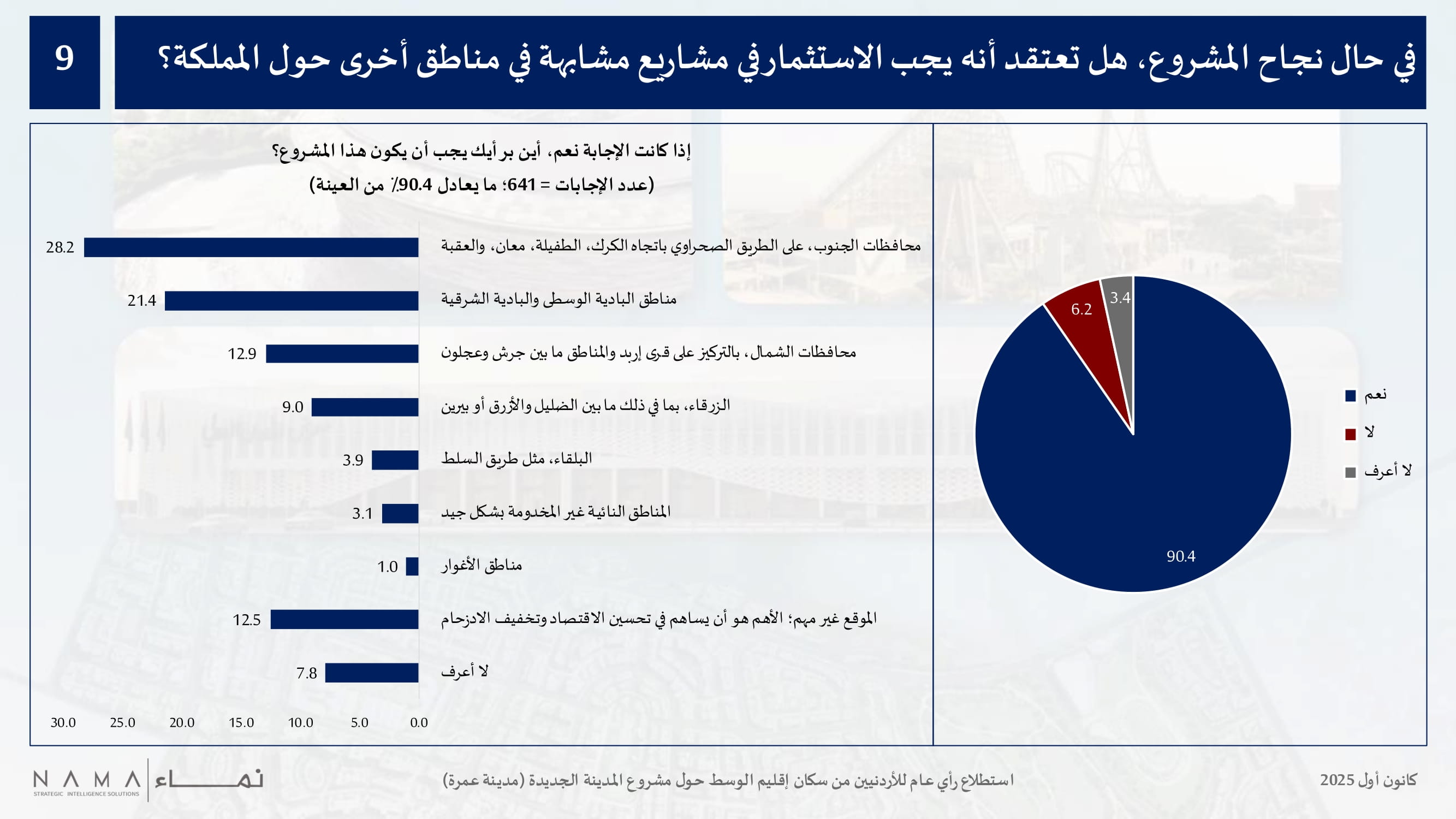 وبالمجمل، يعتقد 90.4 بالمئة أنه في حال نجاح المشروع، يجب الاستثمار في مشاريع مشابهة في مناطق أخرى حول المملكة. وعند سؤالهم عن المكان الذي يجب تخصيصه لمشروع مشابه، أشار 28 بالمئة إلى محافظات الجنوب، ابتداء من الطريق الصحراوي باتجاه الكرك، الطفيلة، معان، والعقبة، بينما قال 21.4 بالمئة أنه يجب أن يكون في مناطق البادية الوسطى والبادية الشرقية، و13 بالمئة ممن أفادوا أنه يجب أن يكون في محافظات الشمال، بالتركيز على قرى إربد والمناطق ما بين جرش وعجلون، و9 بالمئة ممن أشاروا إلى أنه يجب أن يكون في الزرقاء، بما في ذلك المنطقة ما بين الضليل والأزرق، فضلا عن مناطق أخرى مذكورة بنسب أقل، وفي المقابل، شدد 13 بالمئة على أن الموقع غير مهم بقدر أهمية أن يساهم في تحسين الاقتصاد، وخلق فرص عمل، وتخفيف الازدحام السكاني والمروري.