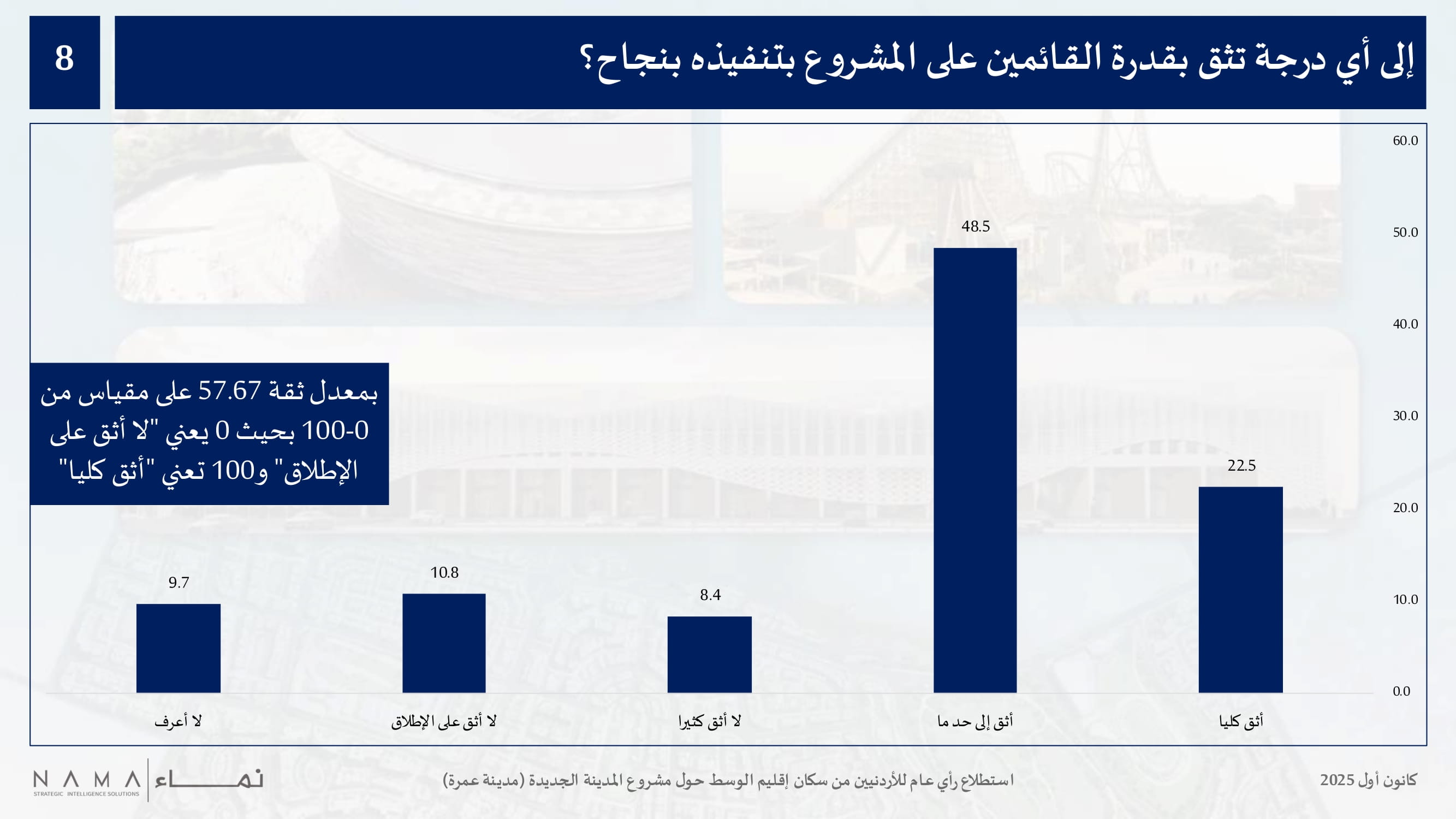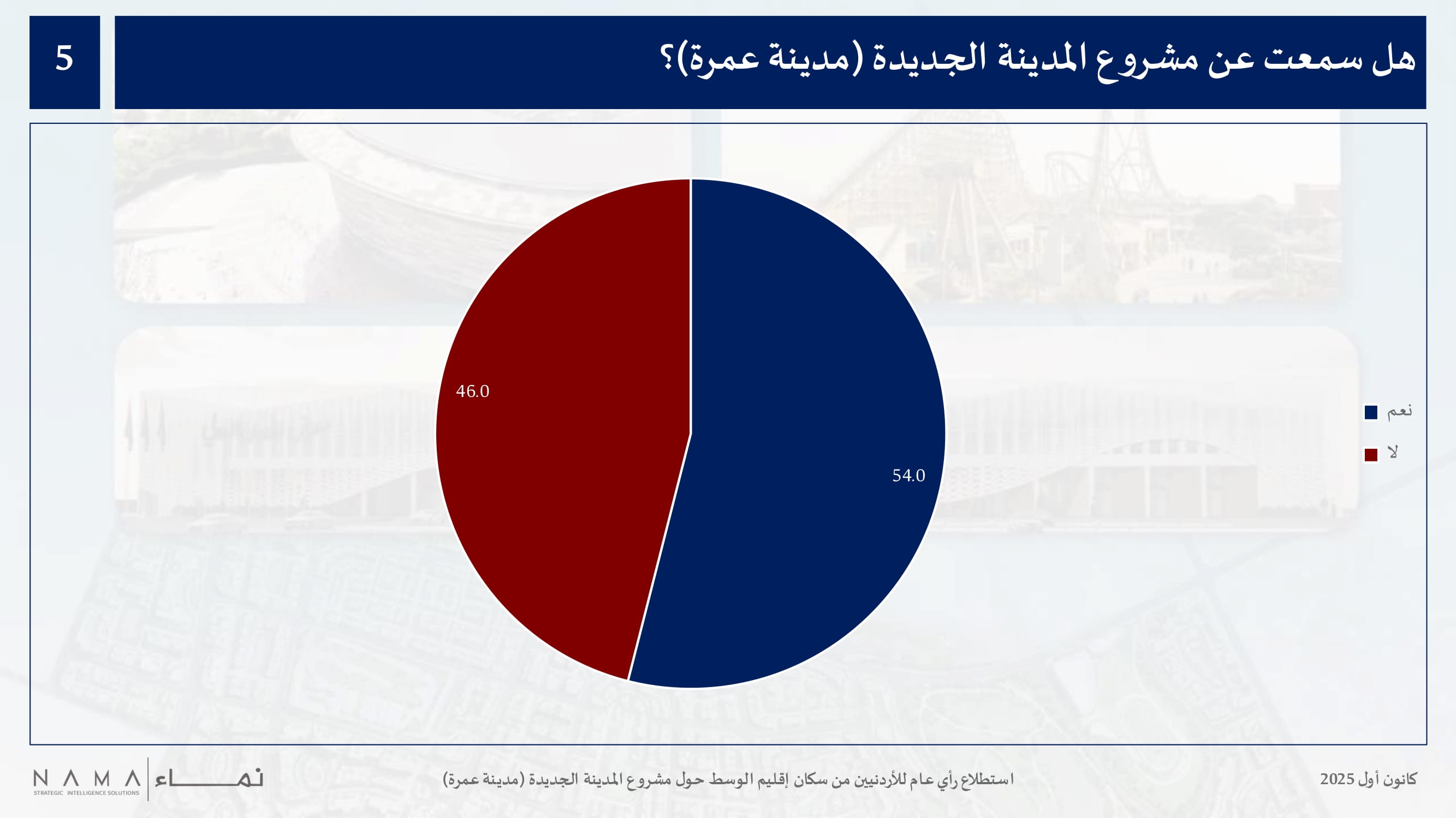 وكشفت نتائج الاستطلاع عن مستوى وعي متوسط حول مشروع المدينة الجديدة، حيث كانت نسبة الأردنيين من إقليم الوسط الذين سمعوا عن المشروع 54 بالمئة.