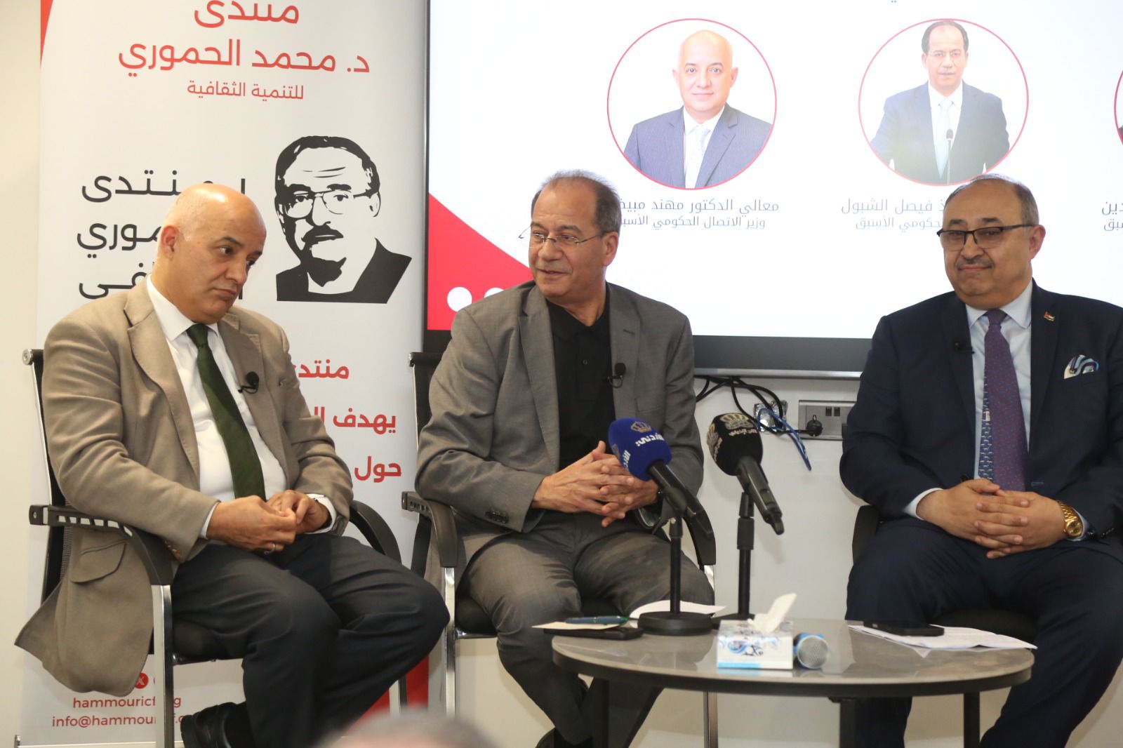 عمون - نظم منتدى محمد الحموري للتنمية الثقافية مساء السبت، حوارية بعنوان "الرواية الإعلامية الأردنية"، شارك فيها الوزراء السابقون فيصل الشبول، صخر دودين، ومهند المبيضين.