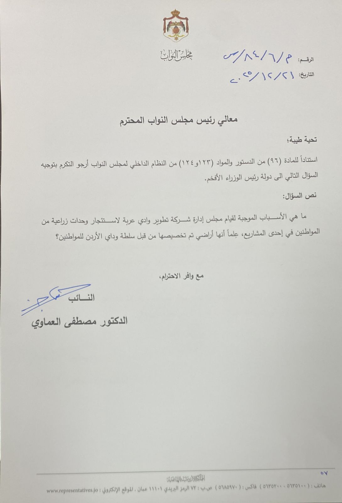 وفي ملف الأراضي والزراعة، وجّه العماوي سؤالًا إلى رئيس الوزراء حول الأسباب الموجبة لقيام مجلس إدارة شركة تطوير وادي عربة باستئجار وحدات زراعية من مواطنين، رغم أن هذه الأراضي مخصصة أساسًا لهم من قبل سلطة وادي الأردن ضمن مشاريع رسمية، متسائلًا عن الأسس القانونية والإدارية التي استند إليها هذا القرار.