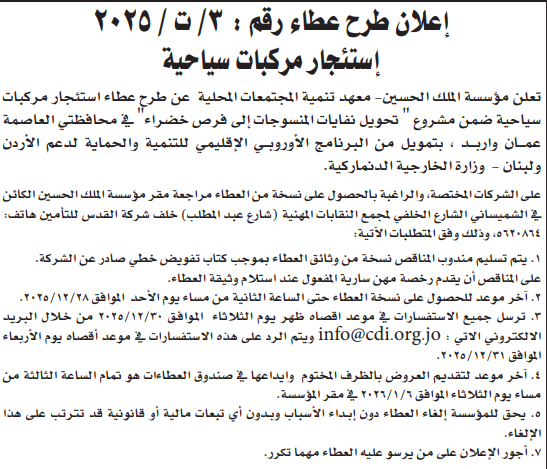 عطاء استئجار مركبات سياحية لمؤسسة الملك الحسين
