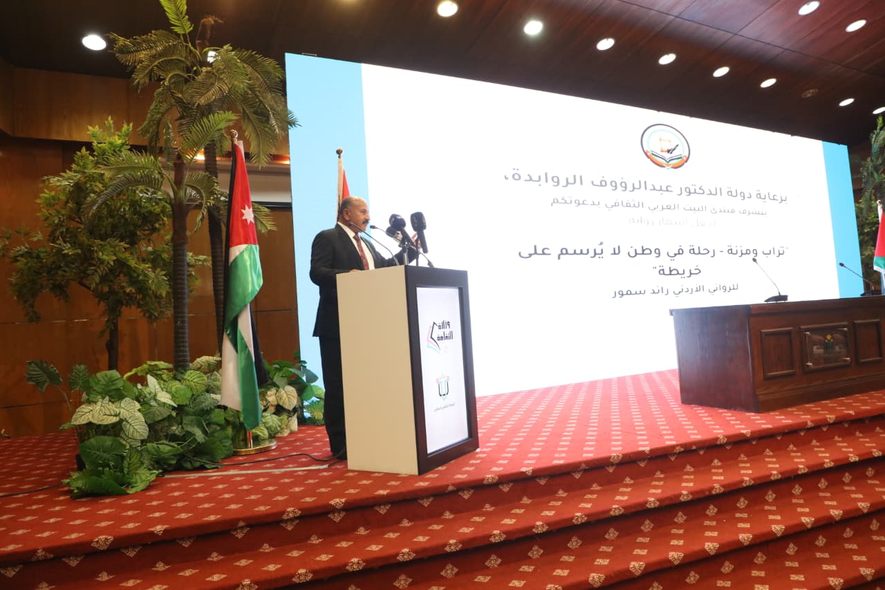عمون - رعى رئيس الوزراء الاسبق الدكتور عبدالرؤوف الروابدة الحفل الذي أقامه منتدى البيت العربي الثقافي مساء الأحد، في قاعة المؤتمرات في المركز الثقافي الملكي بمناسبة إشهار رواية "تراب ومزنة.. رحلة في وطن لا يُرسم على خريطة" للكاتب الأردني رائد سمور، بحضور مندوب وزير الثقافة الدكتور نضال العياصرة أمين عام وزارة الثقافة ومدير المركز الثقافي الملكي الأستاذ وصفي الطويل ورئيس اتحاد الكتاب والأدباء الأردنيين الشاعر عليان العدوان، إلى جانب جمع من الكتّاب والمثقفين والإعلاميين وأساتذة الجامعات.