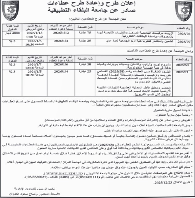 عطاءات صادرة عن جامعة البلقاء التطبيقية