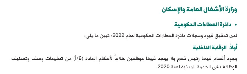 عمون - كشف التقرير السنوي لديوان المحاسبة لعام 2024 عن وجود رؤساء أقسام، في دائرة العطاءات الحكومية التابعة لوزارة الأشغال العامة والإسكان. |