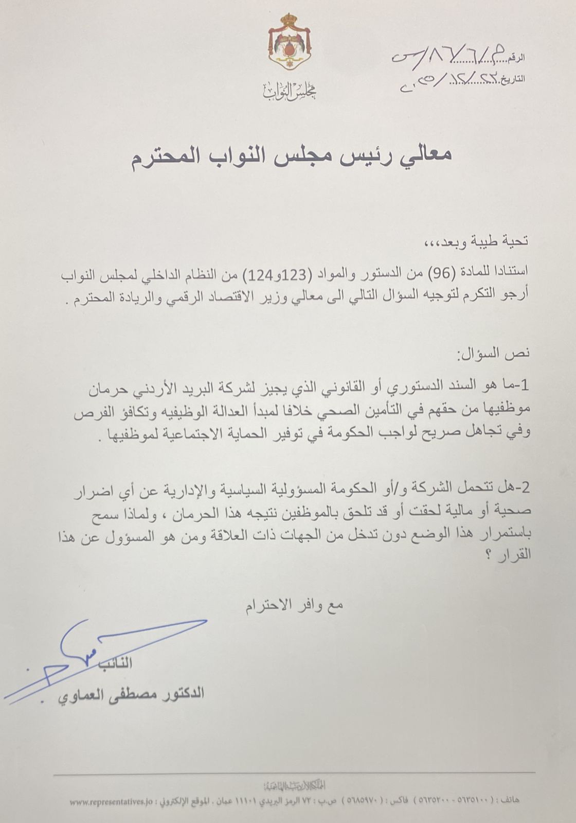 عمون - وجّه النائب الدكتور مصطفى العماوي سؤالاً نيابياً إلى وزير الاقتصاد الرقمي والريادة، استناداً لأحكام المادة (96) من الدستور والمادتين (123 و124) من النظام الداخلي لمجلس النواب، حول حرمان موظفي شركة البريد الأردني من حقهم في التأمين الصحي.