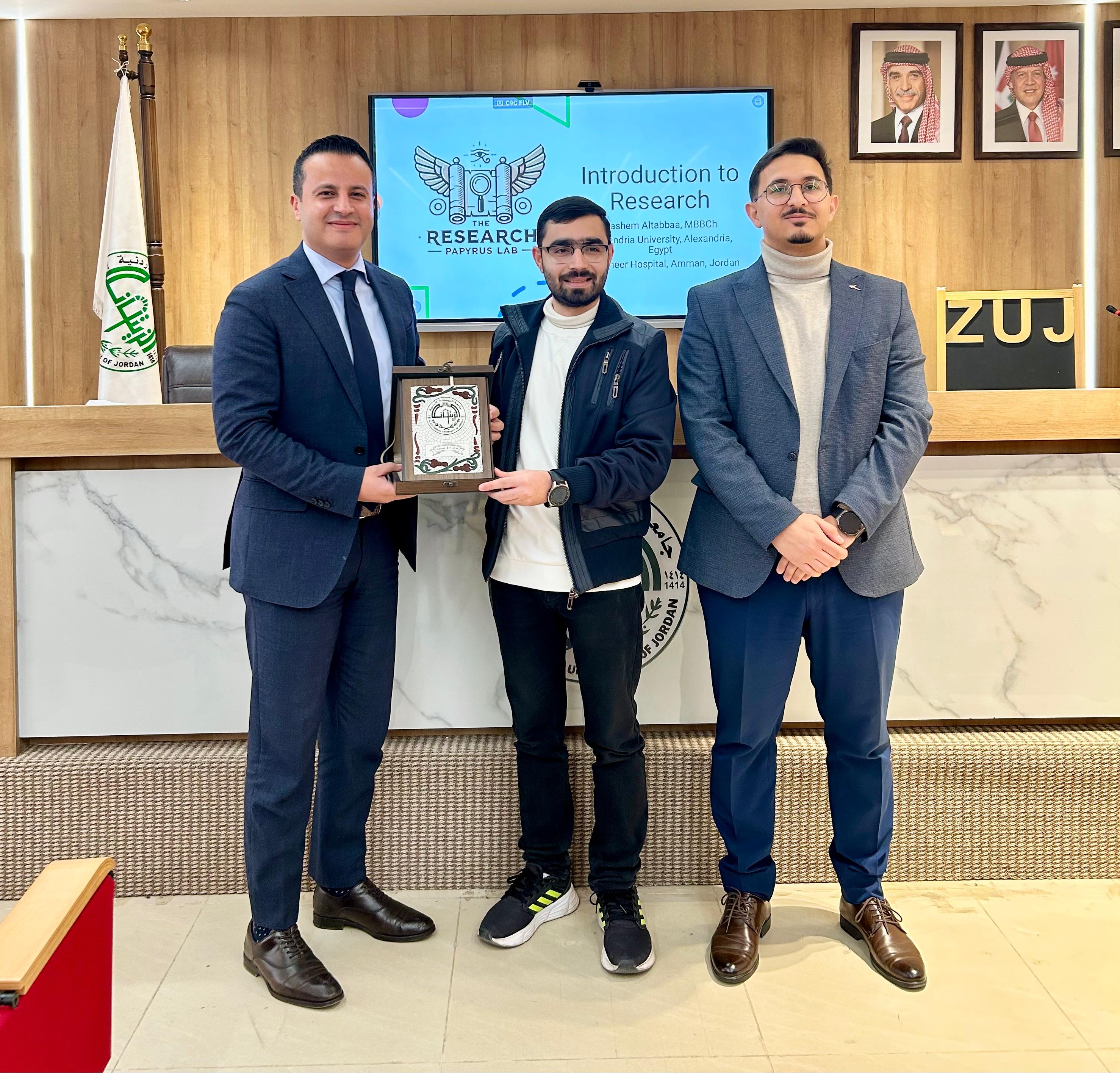 عمون - نظّمت كلية الصيدلة في جامعة الزيتونة الأردنية محاضرة علمية متخصصة بعنوان"From Research Idea to Publication: A Practical Step-by-Step Introduction"، قدّمها الدكتور هاشم الطباع، وذلك بحضور عميد الكلية الأستاذ الدكتور علاء الحسبان، ونائب العميد الدكتور محمد الوحش، إلى جانب عدد من أعضاء الهيئة التدريسية وطلبة الكلية.
