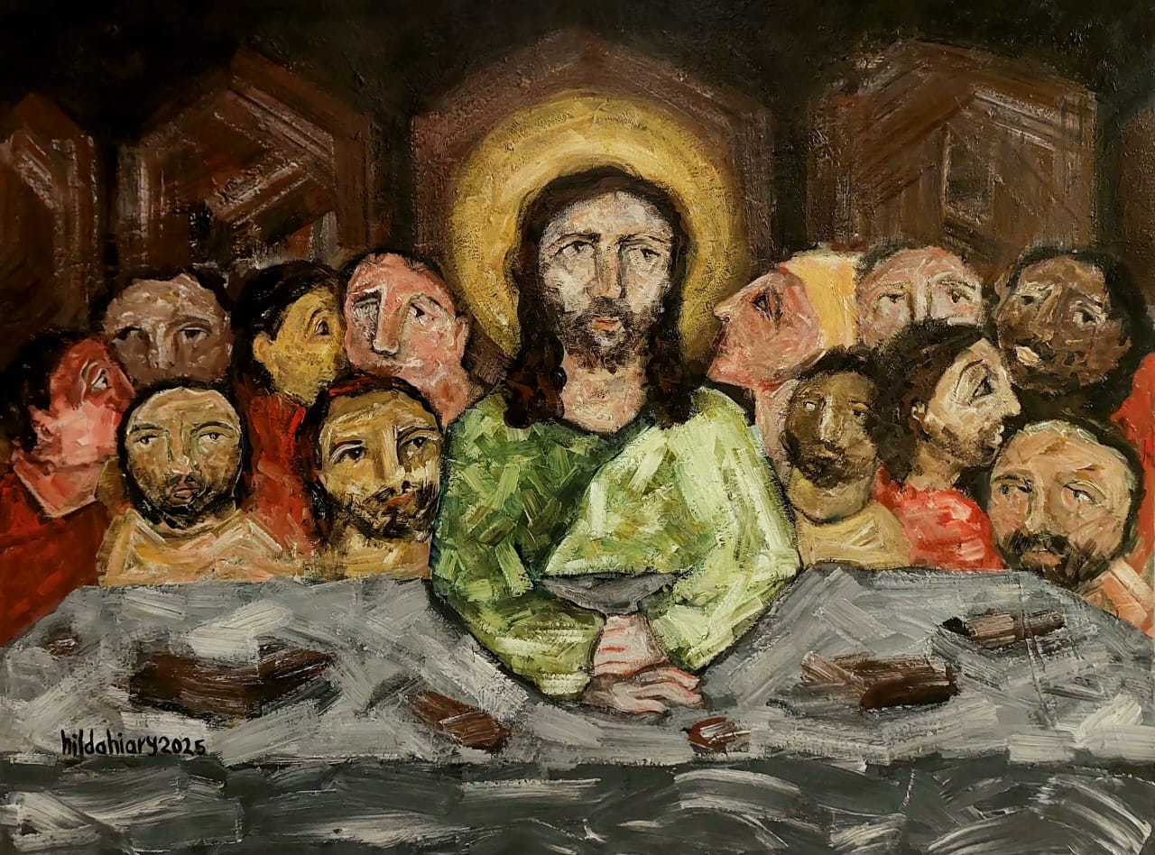 الفنانة التشكيلية الأردنية هيلدا حياري لا تحاور دافينشي من موقع التلميذ، بل من موقع الشاهد. لوحتها لا تسأل: كيف نُبهر العين؟ بل: أين كان هؤلاء حقًا؟ وما الذي شمّته أنوفهم؟ وما الذي كان يثقل صدورهم في تلك الليلة؟