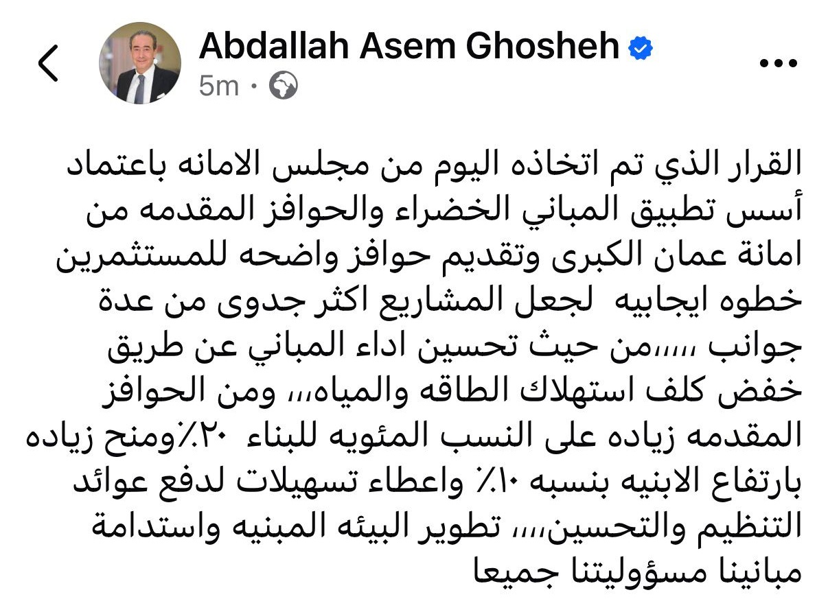 عمون - قال نقيب المهندسين الأردنيين، المهندس عبدالله غوشة، إن القرار الذي اتخذه مجلس أمانة عمّان الكبرى اليوم باعتماد أسس تطبيق المباني الخضراء، وإقرار الحوافز المقدمة من الأمانة، يُعد خطوة إيجابية تسهم في جعل المشاريع أكثر جدوى من عدة جوانب. |