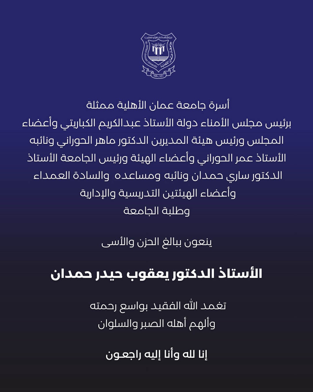 عمون - أسرة جامعة عمان الأهلية ممثلة برئيس مجلس الأمناء دولة الأستاذ عبد الكريم الكباريتي وأعضاء المجلس ورئيس هيئة المديرين الدكتور ماهر الحوراني ونائبه الأستاذ عمر الحوراني وأعضاء الهيئة ورئيس الجامعة الأستاذ الدكتور ساري حمدان ونائبه ومساعده والسادة العمداء وأعضاء الهيئتين التدريسية والإدارية وطلبة الجامعة ينعون ببالغ الحزن والأسى المرحوم الأستاذ الدكتور يعقوب حيدر حمدان. |