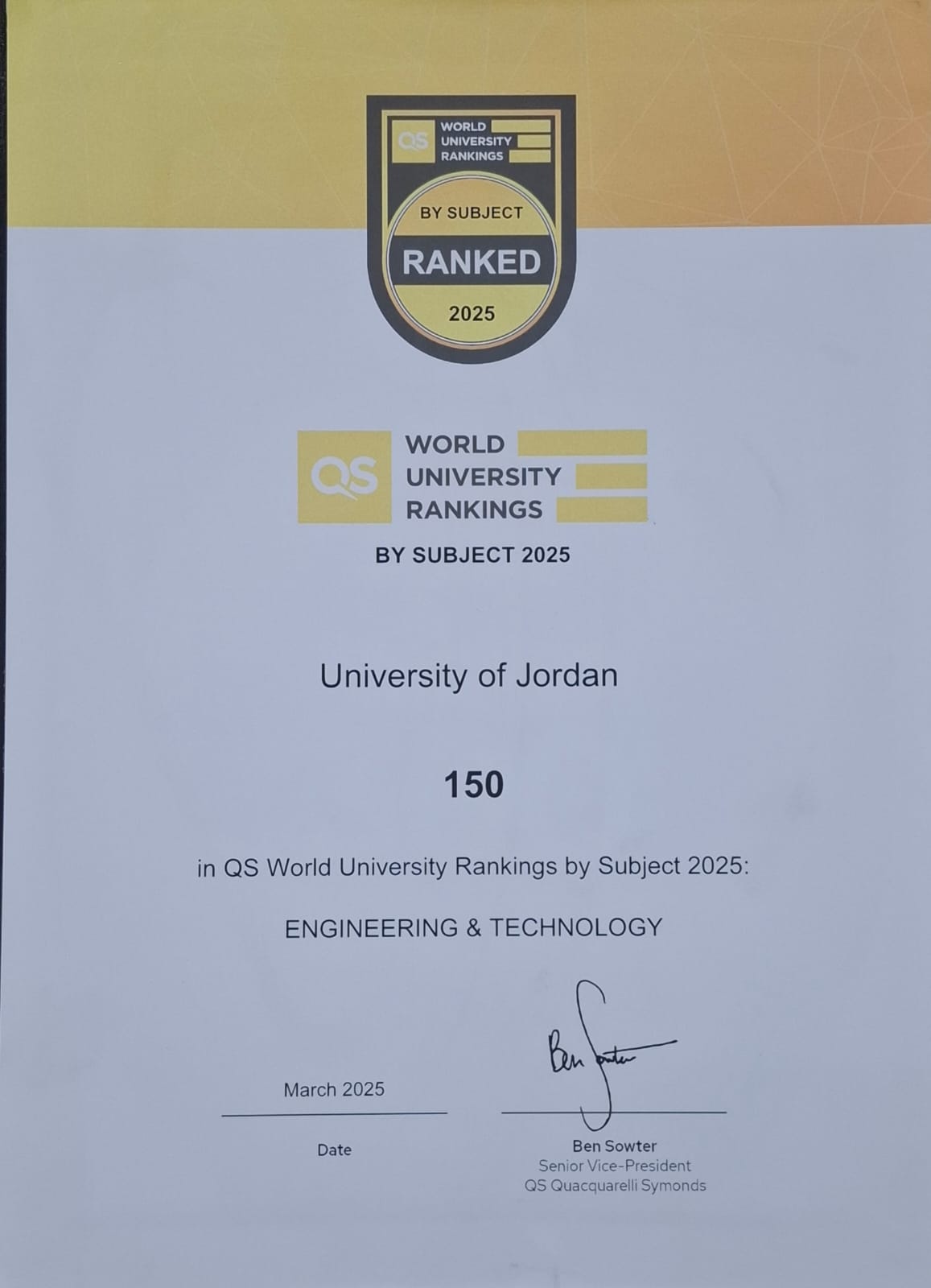 ويذكر أن كلية الهندسة في الجامعة الأردنية من الكليات المتميزة عالميا حيث حصلت مؤخرا بحسب QS على التصنيف 150 عالميا.