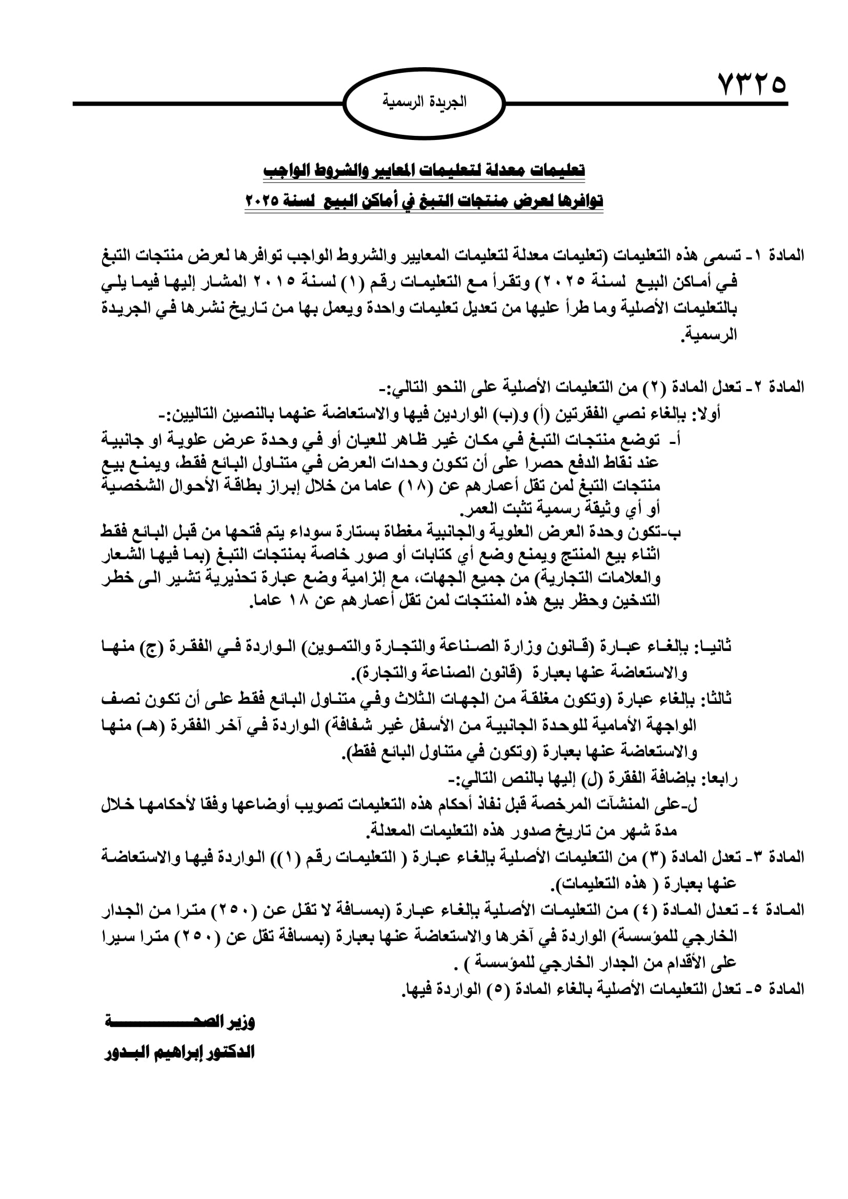 المادة 1 - تسمى هذه التعليمات تعليمات معدلة لتعليمات المعايير والشروط الواجب توافرها لعرض منتجات التبغ في أماكن البيع لسنة ٢٠٢٥) وتقرأ مع التعليمات رقم (1) لسنة ٢٠١٥ المشار إليها فيما يلي بالتعليمات الأصلية وما طرأ عليها من تعديل تعليمات واحدة ويعمل بها من تاريخ نشرها في الجريدة الرسمية.