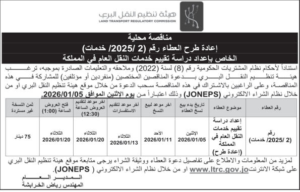 عطاء صادر عن هيئة تنظيم النقل البري