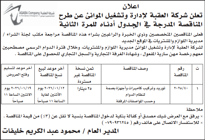 عطاء صادر عن شركة العقبة لادارة وتشغيل الموانئ