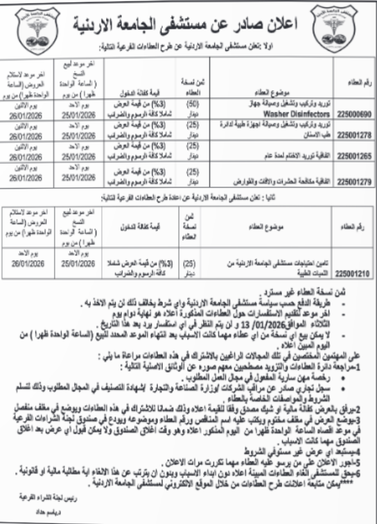 عطاءات صادرة عن مستشفى الجامعة الاردنية