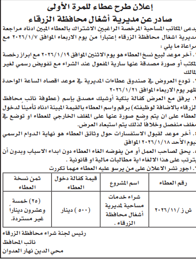 عطاء شراء خدمات مساحية لمديرية اشغال الزرقاء