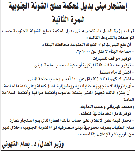 استئجار مبنى بديل لمحكمة صلح الشونة الجنوبية