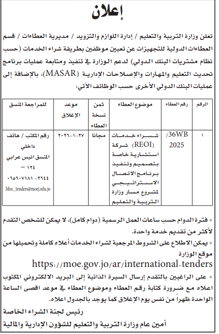 عطاء صادر عن وزارة التربية والتعليم