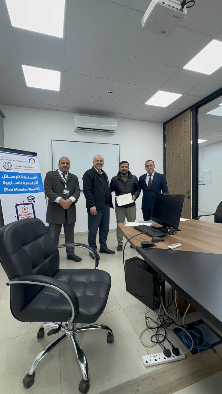 عمون - في إطار سعي جامعة عمان العربية إلى تعزيز مهارات طلبة الدراسات العليا في البحث العلمي، وتمكينهم من عرض ومشاركة أفكار رسائلهم البحثية بأسلوب علمي واحترافي، إلى جانب إكسابهم مهارات الإلقاء والعرض أمام الجمهور، نظّم قسم علم الحاسوب في كلية تكنولوجيا المعلومات النسخة الرابعة من مسابقة "الرسالة في خمس دقائق (Five Minutes Thesis – 5MT)"، بإشراف كلّ من: الدكتور فراس أبو العدس رئيس قسم علم الحاسوب، والأستاذ الدكتور نمير الإمام، والدكتور غيث جرادات، والدكتور عامر أبو جسار، والدكتور ثامر الصرايرة، والدكتور بشار الخصاونة، وبمشاركة طلبة برنامج الماجستير في علم الحاسوب ممن استكملوا مخطط رسائلهم.