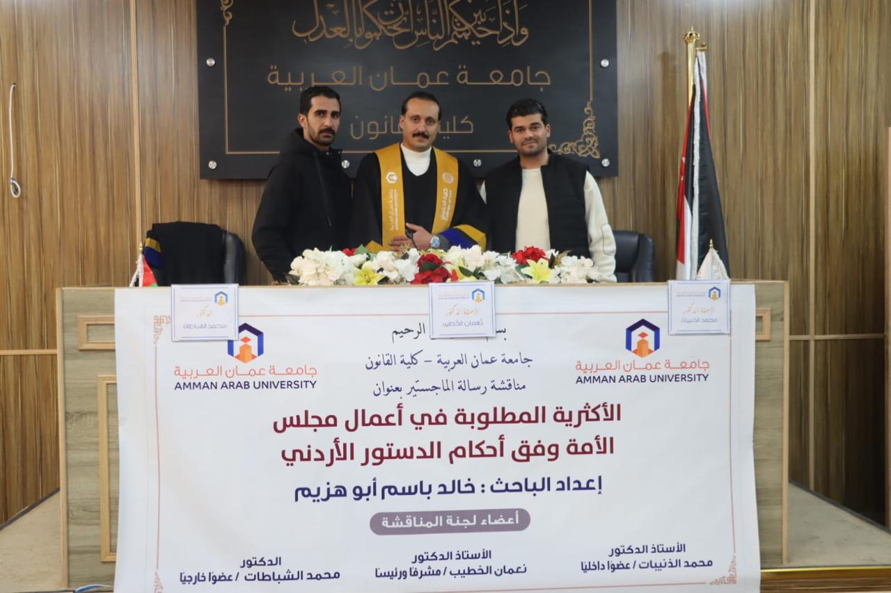 يتقدم الأهل و الاقارب بأصدق التهاني والتبريكات إلى خالد باسم أبو هزيم بمناسبة إتمام متطلبات الحصول على درجة الماجستير في القانون العام بتقدير امتياز، عن رسالته الموسومة بـ«الأكثرية المطلوبة في أعمال مجلس الأمة وفق أحكام الدستور الأردني». |