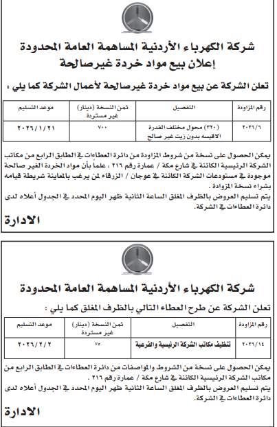 عطاء صادر عن شركة الكهرباء الاردنية المساهمة العامة المحدودة