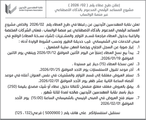 عطاء صادر عن نقابة المهندسين الاردنيين