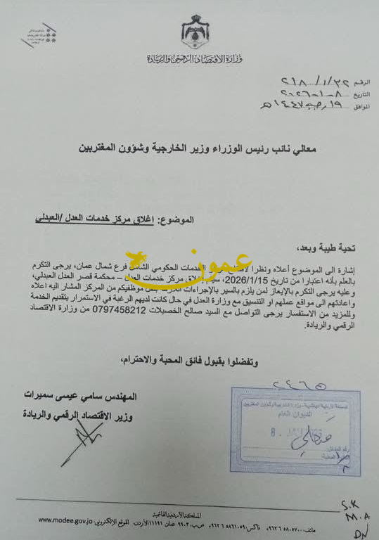 عمون - وجه وزير الاقتصاد الرقمي والريادة المهندس سامي سميرات، كتابا إلى الوزارات المعنية يبلغها بإغلاق مركز خدمات العدل في محكمة قصر العدل العبدلي. |