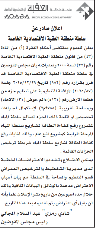 عطاء صادر عن سلطة منطقة العقبة