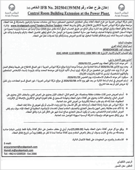 عطاء صادر عن شركة البوتاس العربية