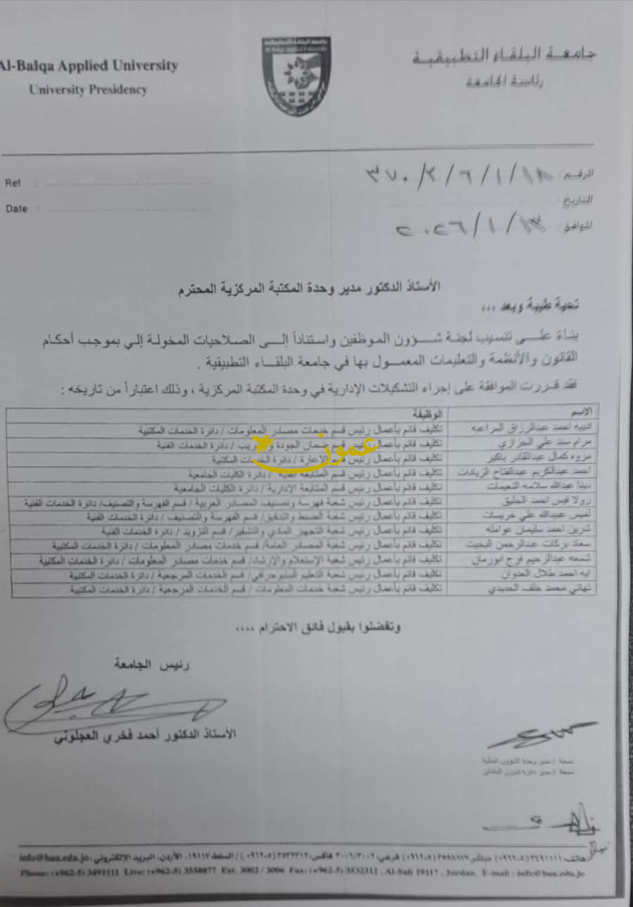 عمون - ينال المعاني - قرر رئيس جامعة البلقاء التطبيقية الدكتور احمد العجلوني إجراء تشكيلات إدارية في وحدة المكتبة المركزية.
