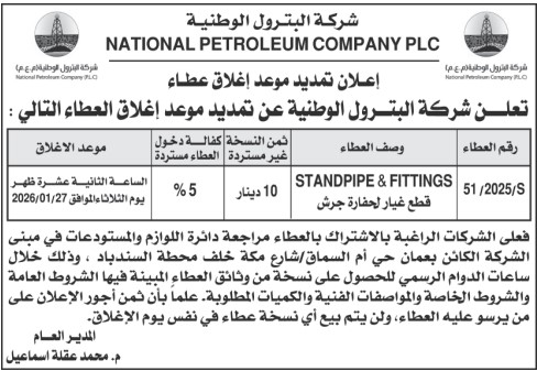 عطاء صادر عن شركة البترول الوطنية