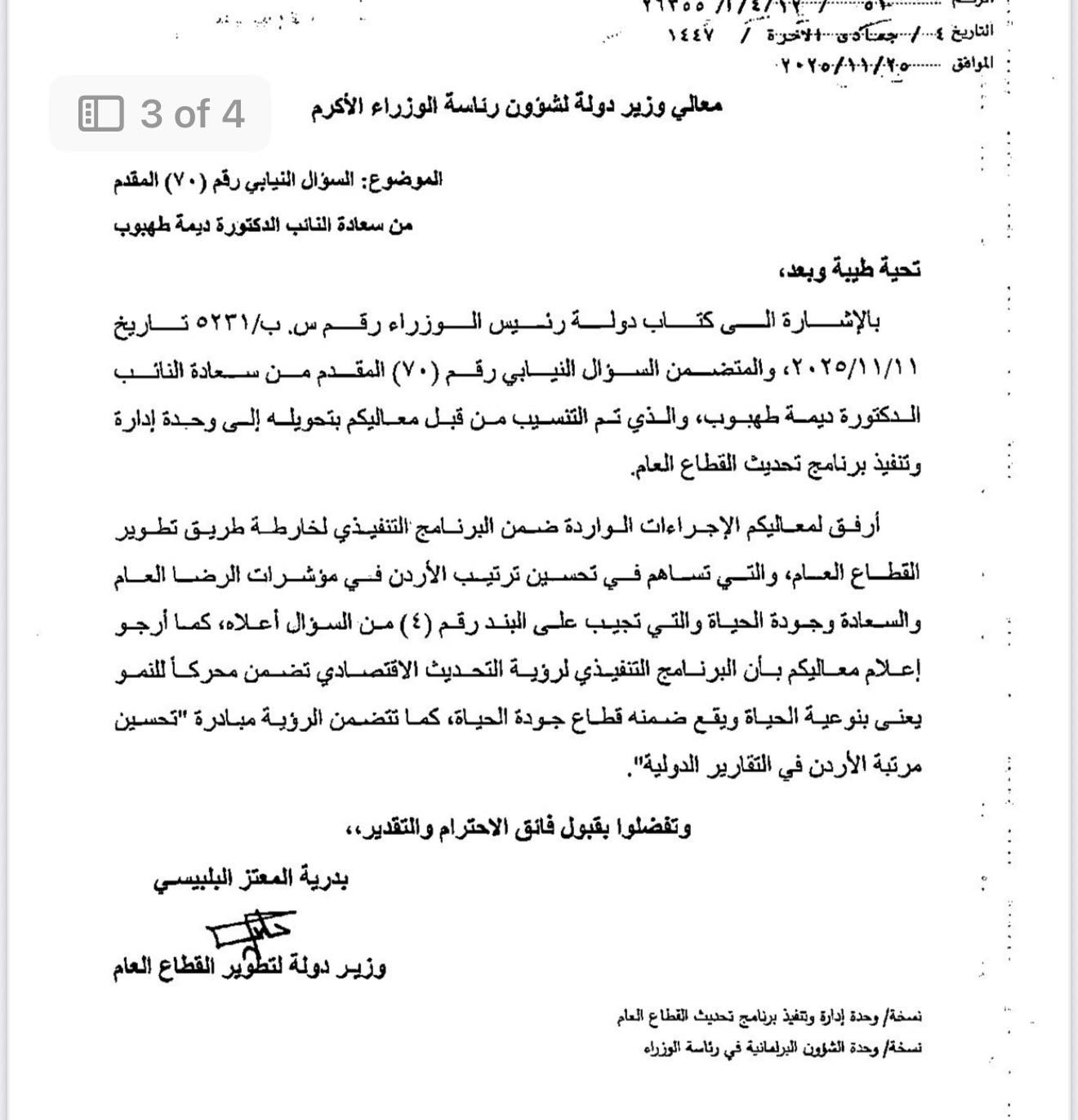 وبينت أنها تلقت جوابا على السؤال الرابع بخصوص خطط الحكومة لتحسين مؤشرات الرضى والسعادة، وقد سرد الجواب المقدم من وزارة تطوير القطاع العام ما تنوي أن تقوم به الوزارة تنظيميًا وإداريًا، لكنه من زاوية رقابية وبرلمانية لا يزال أقرب إلى عرض برامج منه إلى إجابة على سؤال مؤشرات.