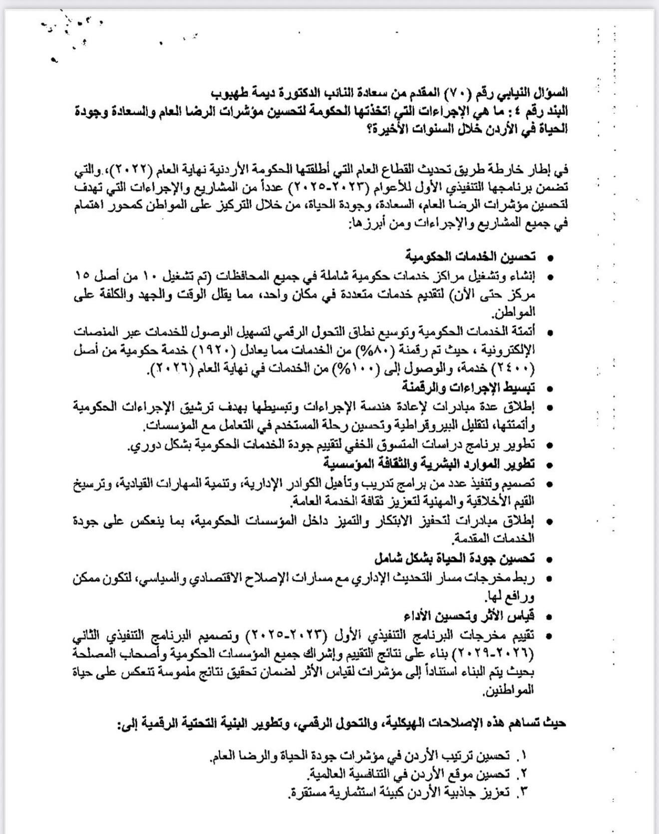 ٤. ما هي الإجراءات التي اتخذتها الحكومة لتحسين مؤشرات الرضى العام والسعادة وجودة الحياة في الأردن خلال السنوات الأخيرة؟