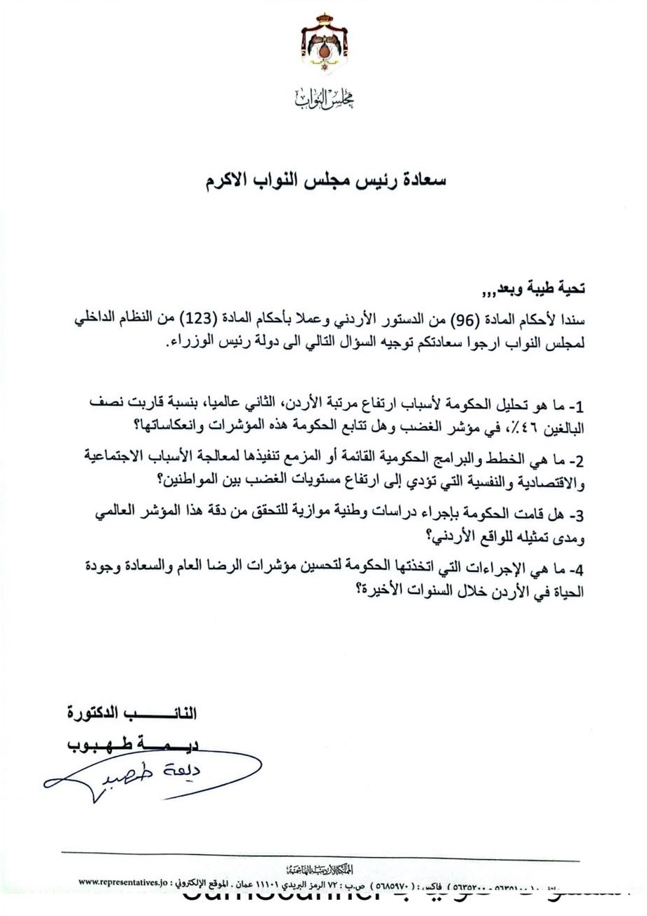 عمون - كشف النائب ديمة طهبوب عن اجابات الحكومة على سؤال نيابي وجهته لها حول احتلال الاردنيين مراتب متقدمة في تصنيف الشعوب الأكثر غضبا.