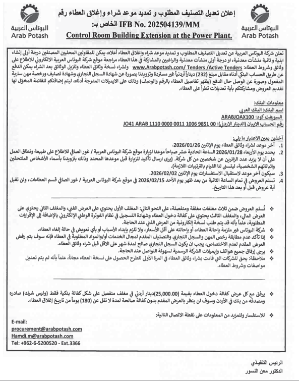 عطاء صادر عن شركة البوتاس العربية