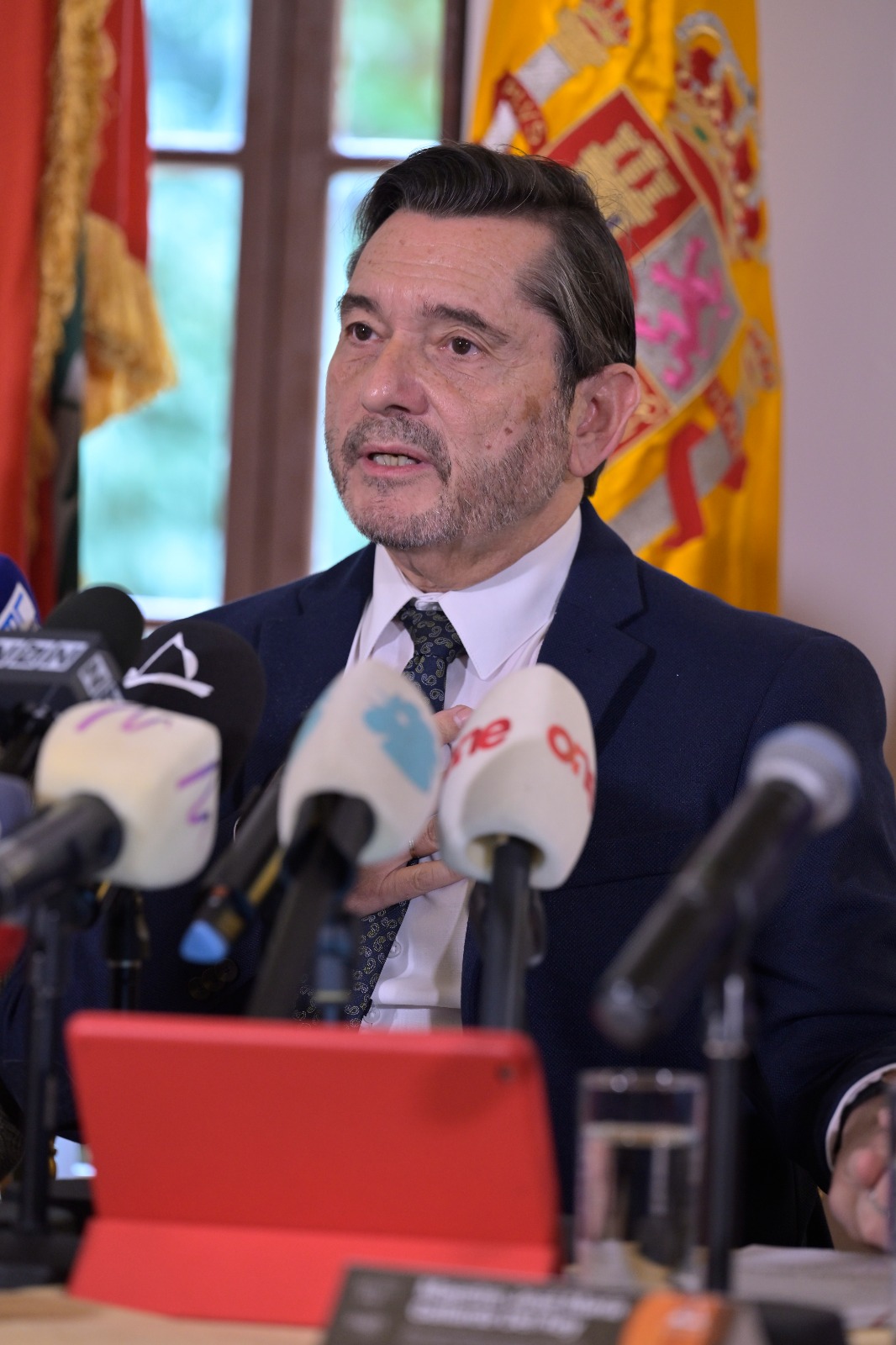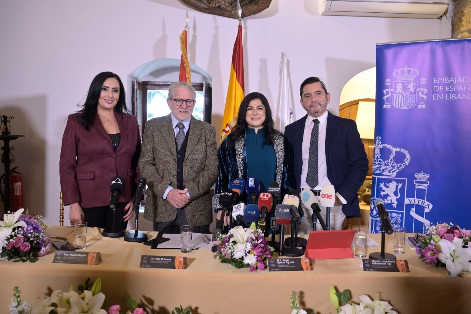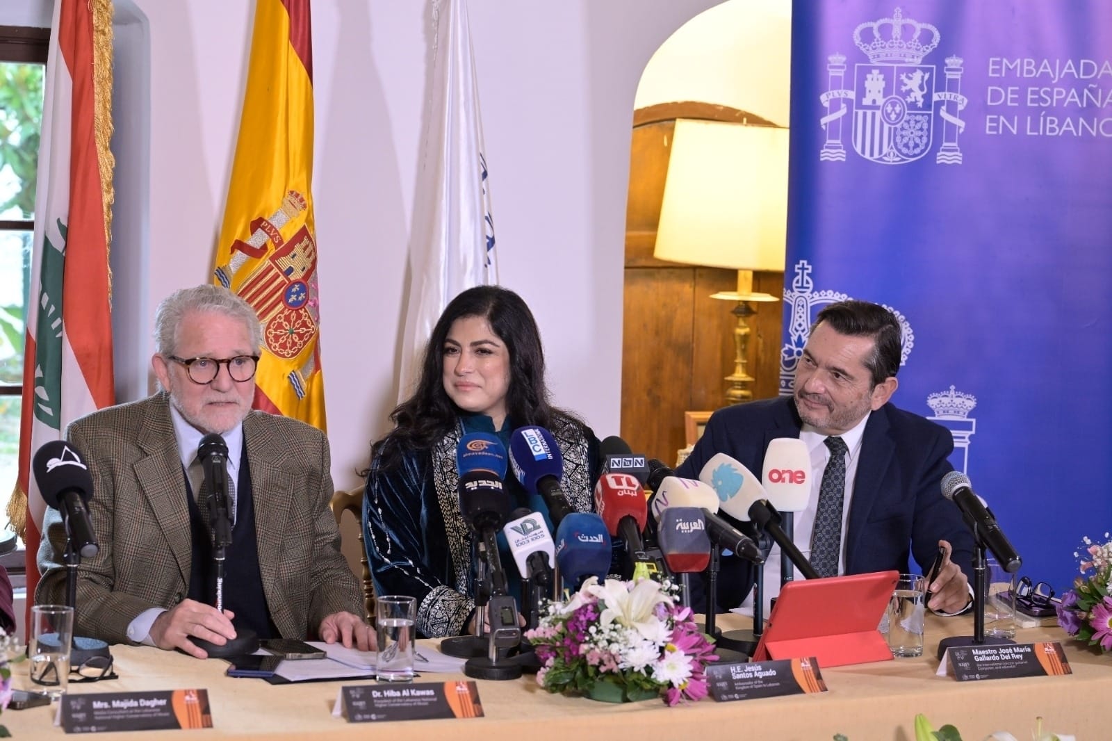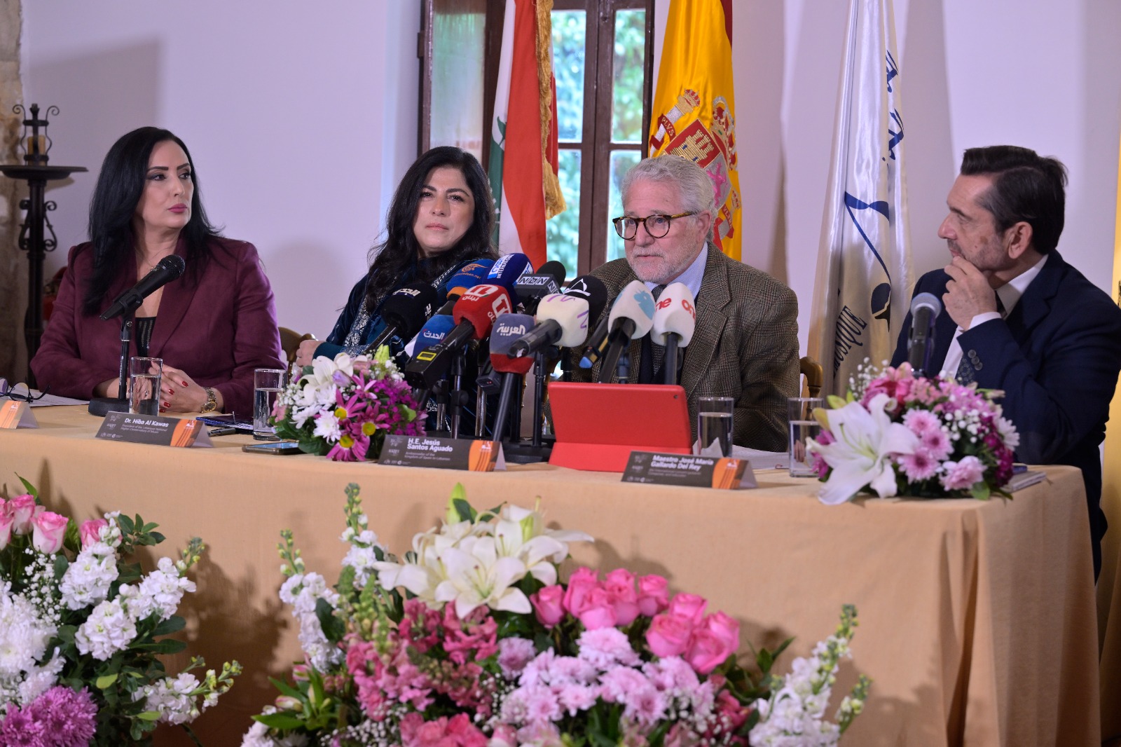 افتتحت المؤتمر المستشارة الإعلامية في المعهد الوطني العالي للموسيقى ماجدة داغر مرحّبة بالحضور وبالإعلاميين. ثم كانت الكلمة الأولى للسفير الإسباني خيسوس سانتوس أغوادو أثنى فيها على "العمل الدؤوب الذي يتميز به كل من رئيسة المعهد الوطني العالي للموسيقى هبة القواس والعازف العالمي والمؤلف الموسيقي الاسباني خوسيه ماريا غياردو لإنجاح المشروع". وقال إن هذا الحدث "هو استمرارية للأعمال المشتركة التي تجمعنا منذ ثلاث سنوات، وما قدمناه سوياً من حفلات موسيقية ناجحة على المستوى الإسباني اللبناني بالتعاون الوثيق مع رئيسة الكونسرفتوار. وكذلك على المستوى الأكاديمي من خلال الـماستر كلاسز التي يقوم بها العازف غياردو ديل راي لطلاب الكونسرفتوار، ومشاركاته الدائمة بالعديد من الحفلات مع المعهد والأوركسترا. ونأمل أن يشارك عازفو الغيتار من كل أنحاء العالم في هذه الجائزة، ويعزفوا الموسيقى الإسبانية في بيروت". مشيرا إلى أهمية التعاون الدولي في هذا المجال والعلاقة الممتازة التي تربط لبنان وإسبانيا، مشدداً على عمق الروابط الثقافية بين البلدين، معتبراً أن دعم هذا المهرجان هو استثمار في الجمال والإبداع الذي يجمع الشعوب. وعبّر السفير عن امتنانه للمؤسسات الإسبانية الداعمة للمشروع وهي: جمعية المؤلفين والناشرين SGAE، والوكالة الإسبانية للتعاون الدولي من أجل التنمية، القسم الثقافي، التابعة لوزارة الخارجية والاتحاد الأوروبي والتعاون، ومؤسسة ألكري لفنون الغيتار".