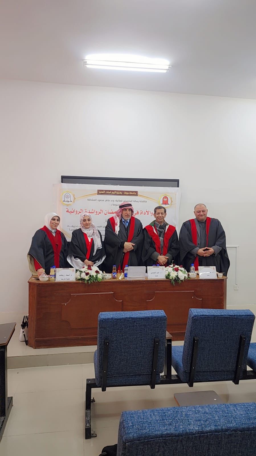 عمون - منحت كلية الآداب بجامعة مؤتة الطالبة وعد المشانكة درجة الماجستير في الآداب عن رسالتها بعنوان " الرؤية والأداء في أعمال رمضان الرواشدة الروائية ". |